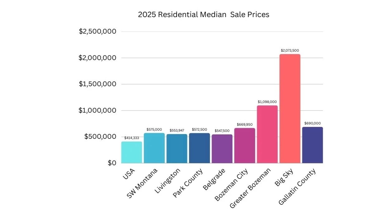 Local trends also differ by community. Within Bozeman city limits and in Belgrade, both sales and median prices increased. However, sales volume declined in Belgrade while rising in Bozeman, highlighting the continued growth of higher-end homes within the Bozeman market.